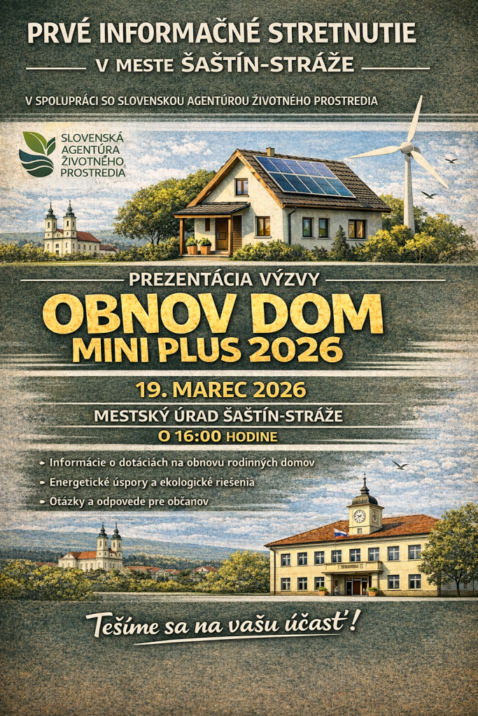 Prvé informačné stretnutie v našom meste v spolupráci so Slovenskou agentúrou životného prostredia, ktoré sa uskutoční 19.3.2026 na Mestskom úrade v Šaštíne-Strážach o 16:00 hod.