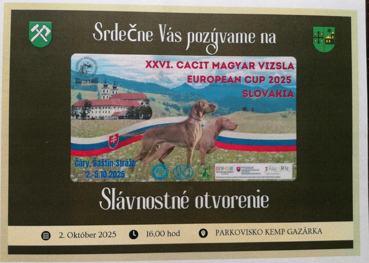 Vo štvrtok 2. októbra 2025 začína na parkovisku a v kempe na Gazárke - XXVI. ročník CACIT Európsky pohár maďarských vyžiel 2025 konaný na Slovensku. Slávnostné otvorenie a predstavenie tímov bude o 16.00 hod.