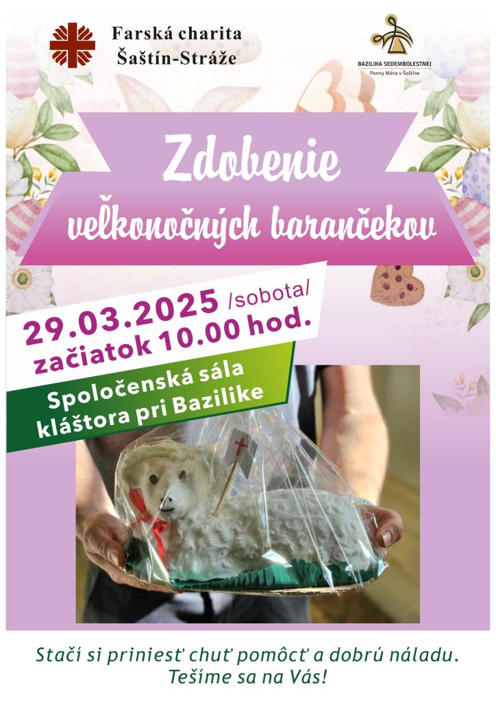 Príďte v sobotu 29.03.2025 od 10:00 hod. do spoločenskej sály kláštora, kde budeme zdobiť veľkonočných barančekov. Okrem zdobenia budeme potrebovať dobrovoľníkov na pomocné práce, preto ste všetci vítaní.